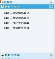 2、在考生自主预约系统主页面中,点击左侧“功能菜单”中的“科目一考试”,将显示有关于科目一考试的相关操作选项,如图所示。