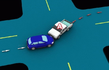 (五)通过没有交通信号灯控制或者交通警察指挥的交叉路口时,遇相对方向来车,左转弯车未让直行车先行的,图中所示为A车负全责。