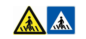 如下图,左边黄底警告的是注意行人;右边蓝底的才是人行横道。