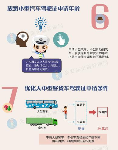 优化大中型客货车驾驶证申请条件,申请大型客车、牵引车驾驶证的年龄下限由26周岁、24周岁降低至22周岁,申请大中型客货车驾驶证年龄上限由50周岁调整至60周岁。