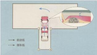 4、观察车外后视镜,适当调整车身与车库边线的距离。当左前门把手与车库底线(即位置3, 4的连线)重合时,立即停车,如下图所示: