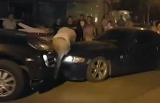 当时,一辆宝马小轿车与一辆保时捷越野车在一处路口对峙,两车驾驶员疑似发生争执。宝马车女司机回到车里,启动车辆准备离开,驾驶保时捷越野车的男子先后拉拽宝马车的副驾车门、敲打引擎盖、拉拽驾驶室车门未果。