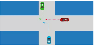 4、如图所示,在这种无信号灯控制的情况下,A车、B车、C车的通行权顺序是什么?