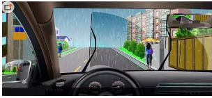 6、如图所示,驾驶机动车在暴雨天气条件下行驶,当刮水器无法刮净雨水影响行车安全时,以下做法正确的是?