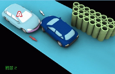 (九)情景2:在没有中心隔离设施或者没有中心线的道路上会车时。在有障碍的一方已驶入障碍路段,无障碍一方未驶入时,无障碍一方未让有障碍的一方现行的,图中所示为A车负全责。