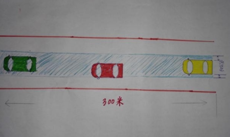 如上图所示,黄色车进入直线行驶考试区,考试系统确认开始的那一刻,先进的电子雷达感应监测设备已经为你规划好了如蓝色区域的路线,在这个区域,考试车两侧的横向间距只有30公分,也就是说车辆一旦偏移大于30公分就被判为不合格,如红色车,驾照考试很多项目常见的30公分都是规定好了的标准,考生应该有30公分的概念,以后自己开车上路也应该严格要求自己保持在30公分范围内的标准,严于律己,驾驶员理应高度负责行驶安全,绝不留半米的马虎。
