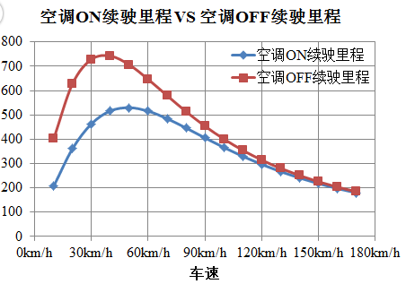 由图可知,40km/h之上,车速越高续驶里程越短(与空调ON、OFF无关)。