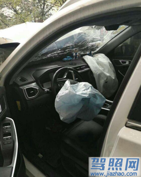 这张可以清晰的看到整个A柱纹丝不动(同时可以看到正驾驶车门开启完全正常,起码人出来是很轻松的),无论是正驾驶一侧还是副驾驶一侧,前挡风玻璃破碎属于正常现象,发动机盖都被彻底卷起击打挡风玻璃,再不碎就真邪门了,不过仅仅是裂纹较多,没有彻底破碎成颗粒状,同时正副驾驶气囊全部打开,合格!气囊袋没有任何血迹,而图片就是车主自己拍摄的,当然惊魂未定没有拍摄高速撞击之后的场面,而是到修理厂之后才想起来拍摄一组图片,人员完全没有任何问题,同时也印证了前面的分析,相对撞击的速度最终并不算太高,当然比试验室里的60Km /h的时速要高不少,这撞击力度已经很大了。