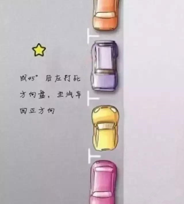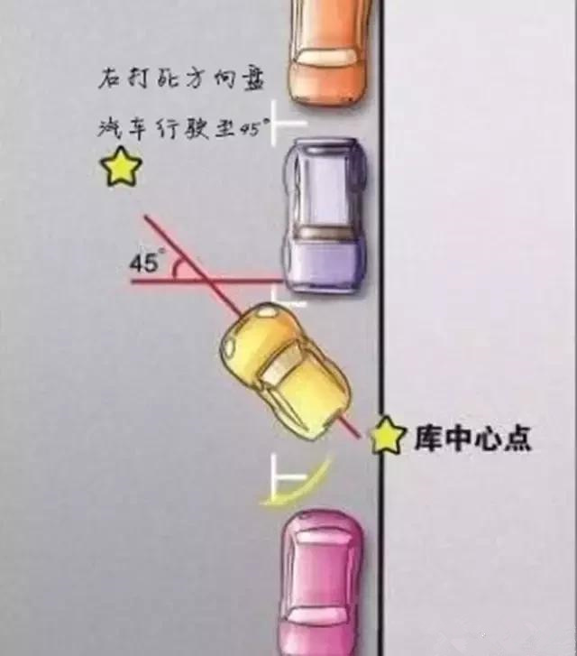 调整好姿势后,右打死方向盘,行驶至与旁边汽车的夹角为45°(目测大约是45°就行)