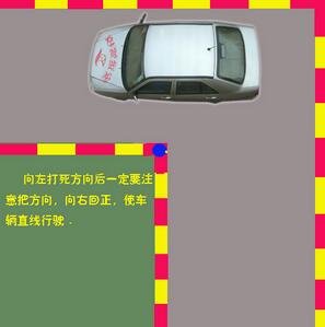 开考后,将车头压红外线后,再缓慢往后倒车。由于倒车时没了标杆,因此整个考试过程只能以地面为参照物,玩的就是“空间感”。在倒车时,当车后门右侧三角窗竖衬应与黄色边线右上角重合,方向盘向右打死,即可顺利入库。