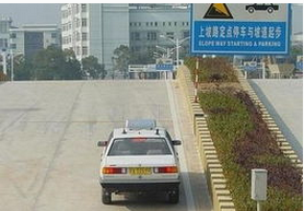 4)定点停车(下坡和平路),要先靠边,再定点。具体来说,在离定点处20m左右迅速将车速慢下来,并尽量使车靠边(离路缘30公分以内),慢慢向前滑行,再在车头到达定点处时迅速踩完刹车。如遇上坡定点停车,这是难中之难。虽然具体操作与前类似,但要根据车速正确估计降速靠边的时机。