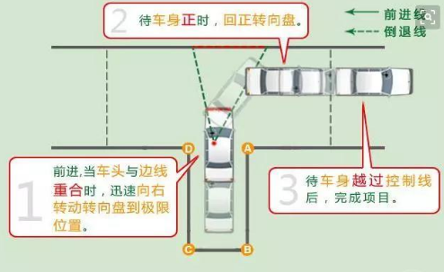 此时需要学员向左至少回正半圈方向,偏移的严重的则需要向左回一圈方向,当右后轮刚好越过库角时,再次向右打死方向。