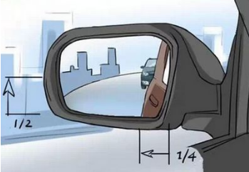 右后视镜:上下位置,地面面积占镜面的2/3,能看到后轮的轮眉(车轮上方突出的部分,弯曲,像眉毛);左右位置,使车身占镜面1/4。