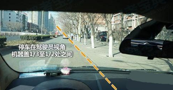 观察车身右侧与马路边缘之间的距离,进行调整。直至右侧前门把手位置,将遮住马路边,或者将“接触”时,在迅速摆直车身。