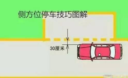 侧方位停车在开始倒库前就必须准确找到车身距离黄线30公分的距离,距离过大,会压侧方位内侧的边线;距离太远,入不了库。