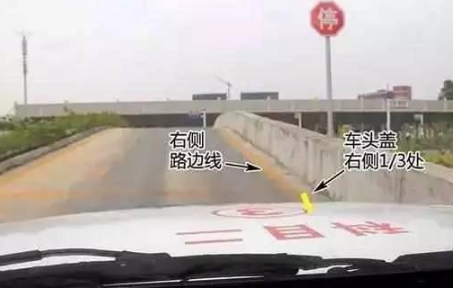 而学员需要看的就是这些参照物上的某点,与马路边缘、地面标线之间的相对关系。