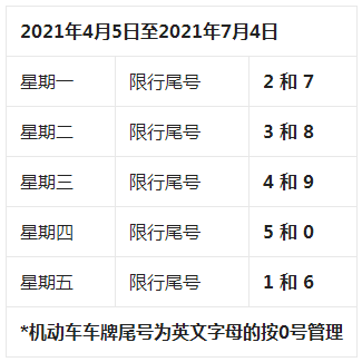 (一)自2021年4月5日至2021年7月4日,星期一至星期五限行机动车车牌尾号分别为:2和7、3和8、4和9、5和0、1和6(机动车车牌尾号为英文字母的按0号管理,下同);