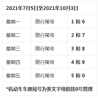 (二)自2021年7月5日至2021年10月3日,星期一至星期五限行机动车车牌尾号分别为:1和6、2和7、3和8、4和9、5和0;