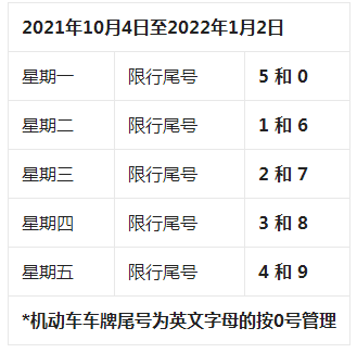 (三)自2021年10月4日至2022年1月2日,星期一至星期五限行机动车车牌尾号分别为:5和0、1和6、2和7、3和8、4和9;