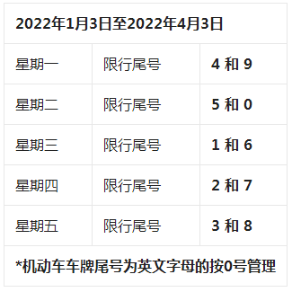 (四)自2022年1月3日至2022年4月3日,星期一至星期五限行机动车车牌尾号分别为:4和9、5和0、1和6、2和7、3和8。
