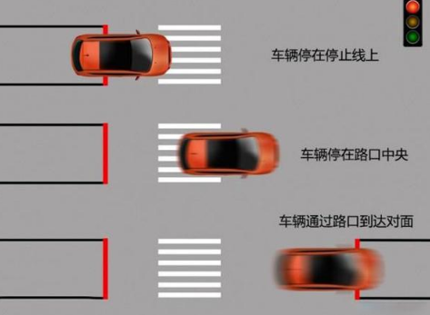 分别是前轮越过停止线,后轮越过停止线,以及前轮超过对面的停止线。(看下图)