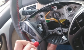 3、方向盘安装好之后,将电子线路重新接口接入相应的位置,随后再将气囊轻轻的放入相应的位置进行固定。放入之后,再将方向盘左右两侧的固定螺丝拧紧;