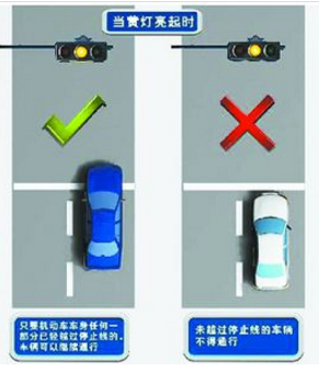 第三十八条第二款:黄灯亮时,已越过停止线的车辆可以继续通行;