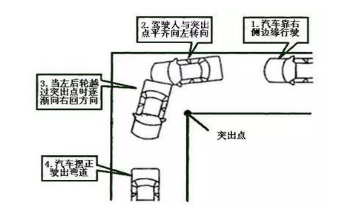 四、当左后轮越过内直角突出点时,开始逐渐向右回方向驶出弯道。