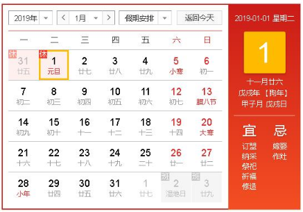 来源:驾照吧 发布:2018-12-252019年元旦放假安排:12月30日至1日放假调休,共3天,12月29日(星期六)正常上班,1月2日(星期三)上班。