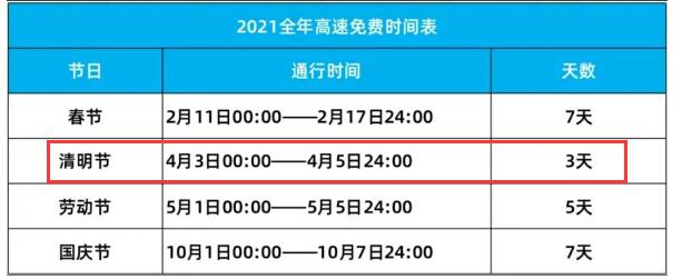 2021年清明节高速免费时间为:4月4日零时开始至4月6日24时,共3天。