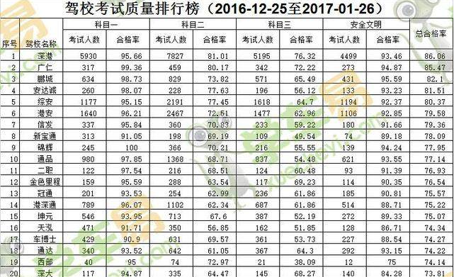 今年2月初,深圳交警部门根据2016年12月25日至2017年1月26日辖区各驾校的考试合格率,公布了开年第一份《驾校考试质量排行榜》。