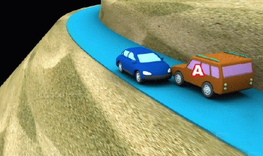 (十一)在没有中心隔离设施或者没有中心线的狭窄山路会车时,在两车难于同时通过的情况下,靠近山体的一方未作减速或停车等避让对方先行的,图中所示为A车负全责。
