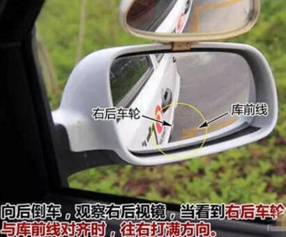 打右转向灯,挂倒挡,缓慢松离合,当车子走动时左脚保持不动。观察右后视镜,当看到右后轮与前库线对齐时,往右打满方向。
