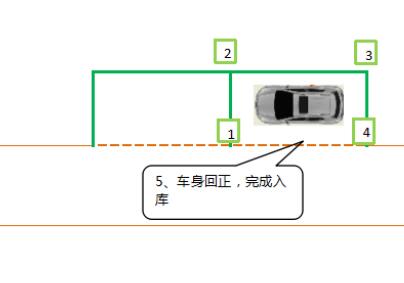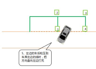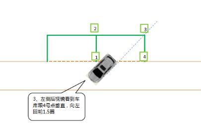 当左侧后视镜看到车库跟4号点垂直(右后角时),向左回轮1.5圈,继续倒车。