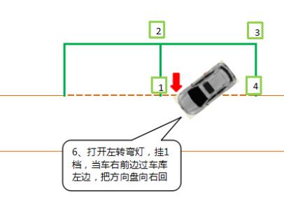 先打开左转弯灯,因为上一步方向盘向左打死的。所以不用回正了,直接挂1档,当车右前边过车库左边,把方向盘向右回一圈半。前进到雨刷尾部过1号点位置,方向盘向右打一圈。