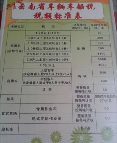 车船税是缴给当地地税局,所以每个地方的车船税金额略有不同,以车为例:车船税是根据车辆排量递增的。下面以云南地区为例请看下图: