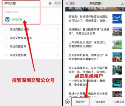 1、搜索【深圳交警】微信公众号并关注,然后在公众号首页点击下方的“星级用户”。